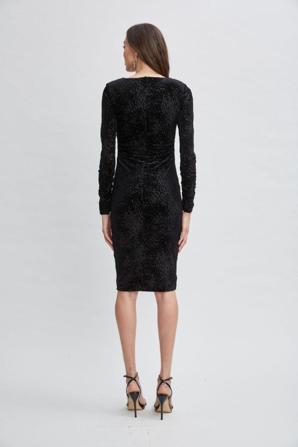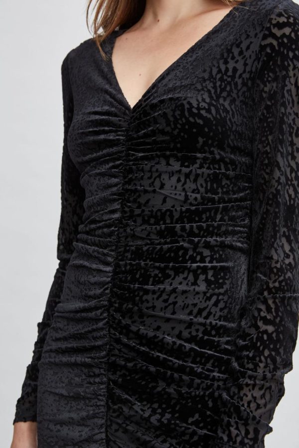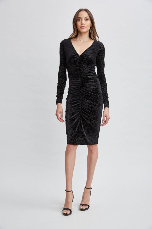- Long Sleeve Burnout Velvet V-Neck Dress with Ruching