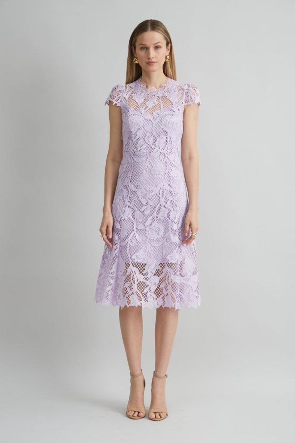 Cut from guipure lace in a geometric floral motif, this lace dress is made for a wedding or party. The body skimming fit, partially lined coverage & flared midi hem with scallop edges create beautiful movement and volume.
