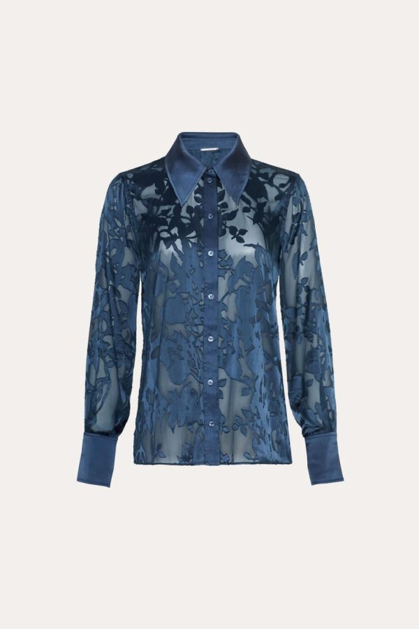 - Silk Floral Burnout Button Down Shirt with Satin Detailing