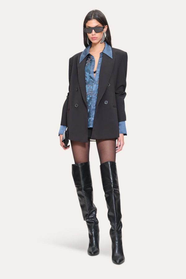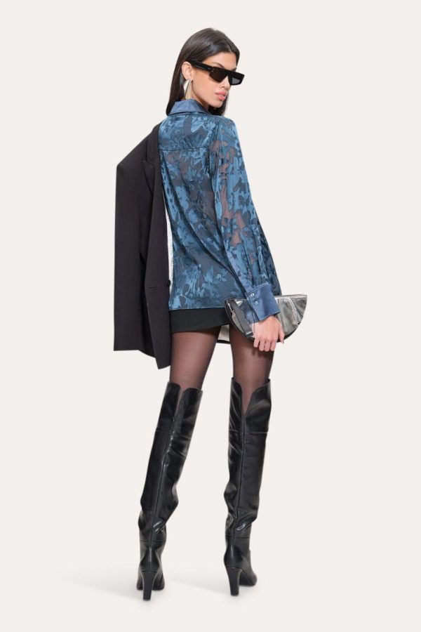 A study in contrasts: sheer silk burnout, framed by a lustrous satin placket, cuffs & collar. Semi-transparent with subtle coverage, it transitions seamlessly from day into evening.