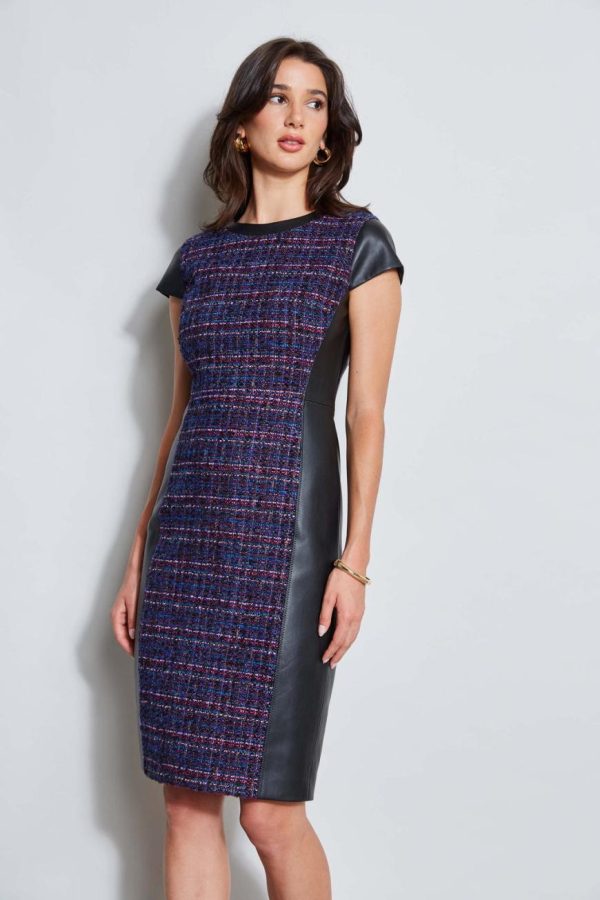 Go all in on city chic with our Vegan Leather Panel Italian Tweed Dress. The modern design features vegan leather short sleeves and side panel detailing that gives the dress its flattering body skimming silhouette. You will love the look & feel of this standout dress.