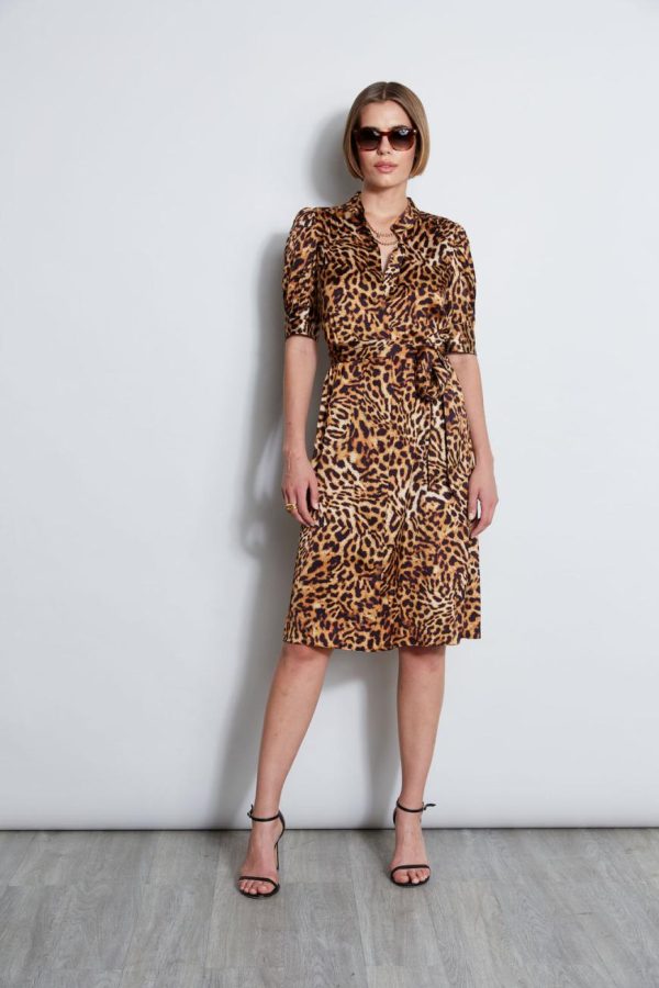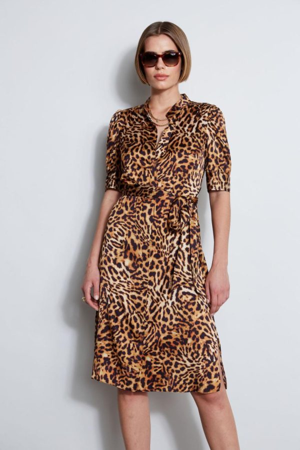 - Short Puff Sleeve Wildcat Cheetah Printed Belted Shirt Dress